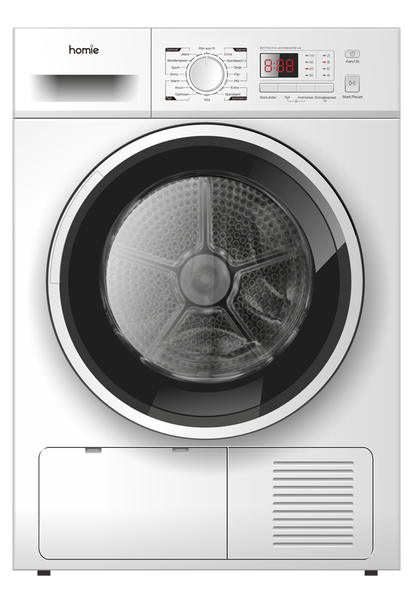 The heat pump dryer has an A++ or E energy label and uses energy more efficiently by determining the cycle time based on the load weight. With this heat pump dryer, you can save up to €80 in electricity costs annually, compared to air vent dryers and traditional condenser dryers. Dutch people run an average of 160 drying cycles per year. With a Homie, you can save up to 50 cents per drying cycle! The dryer does not require an external drain (possible if required) and only needs to be connected to electricity.